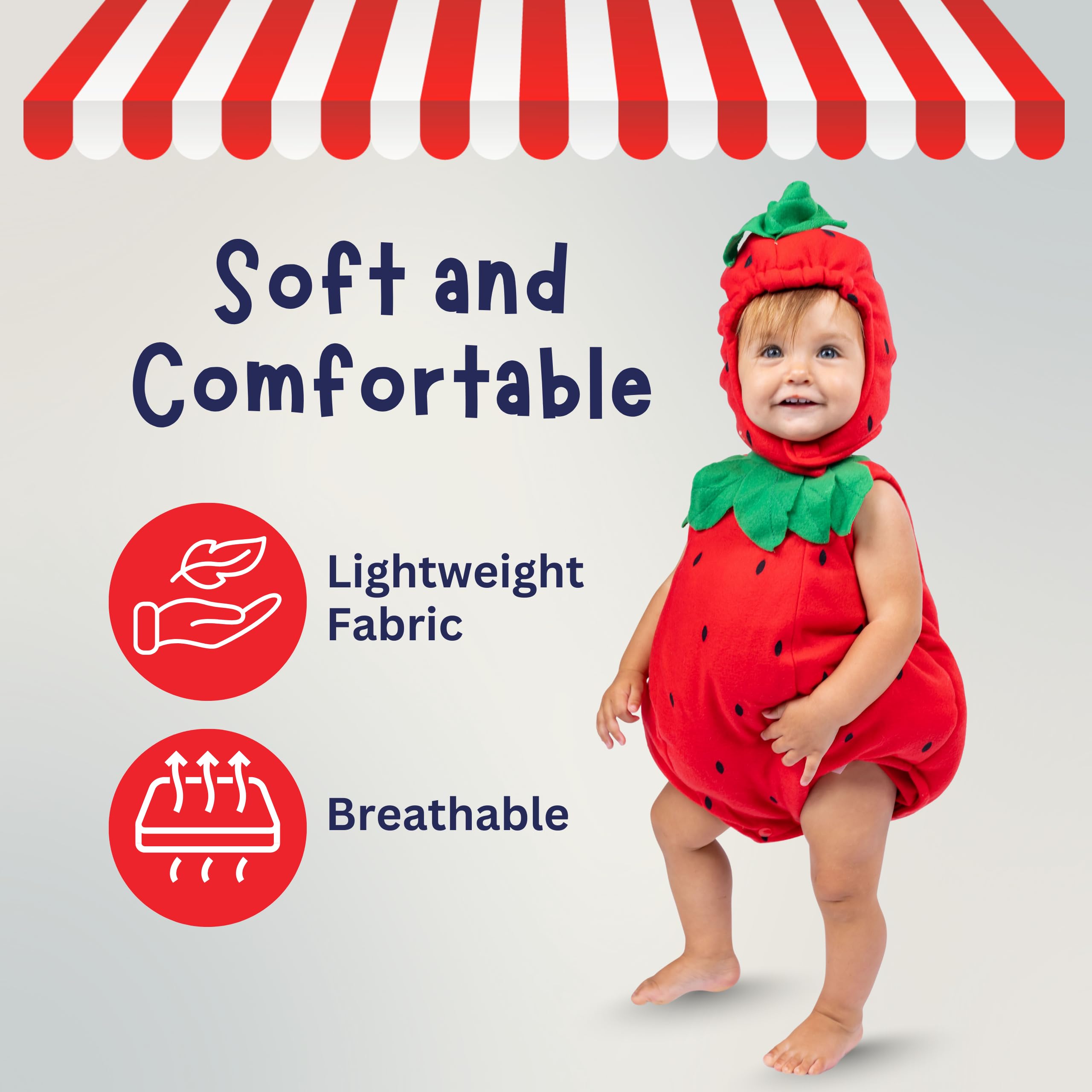 - Berry Cute - The strawberry costume set includes a bubble romper and hood. The costumes are available in sizes 0-6 months, 6-12 months, and 12-24 months. The strawberry romper is soft and comfortable