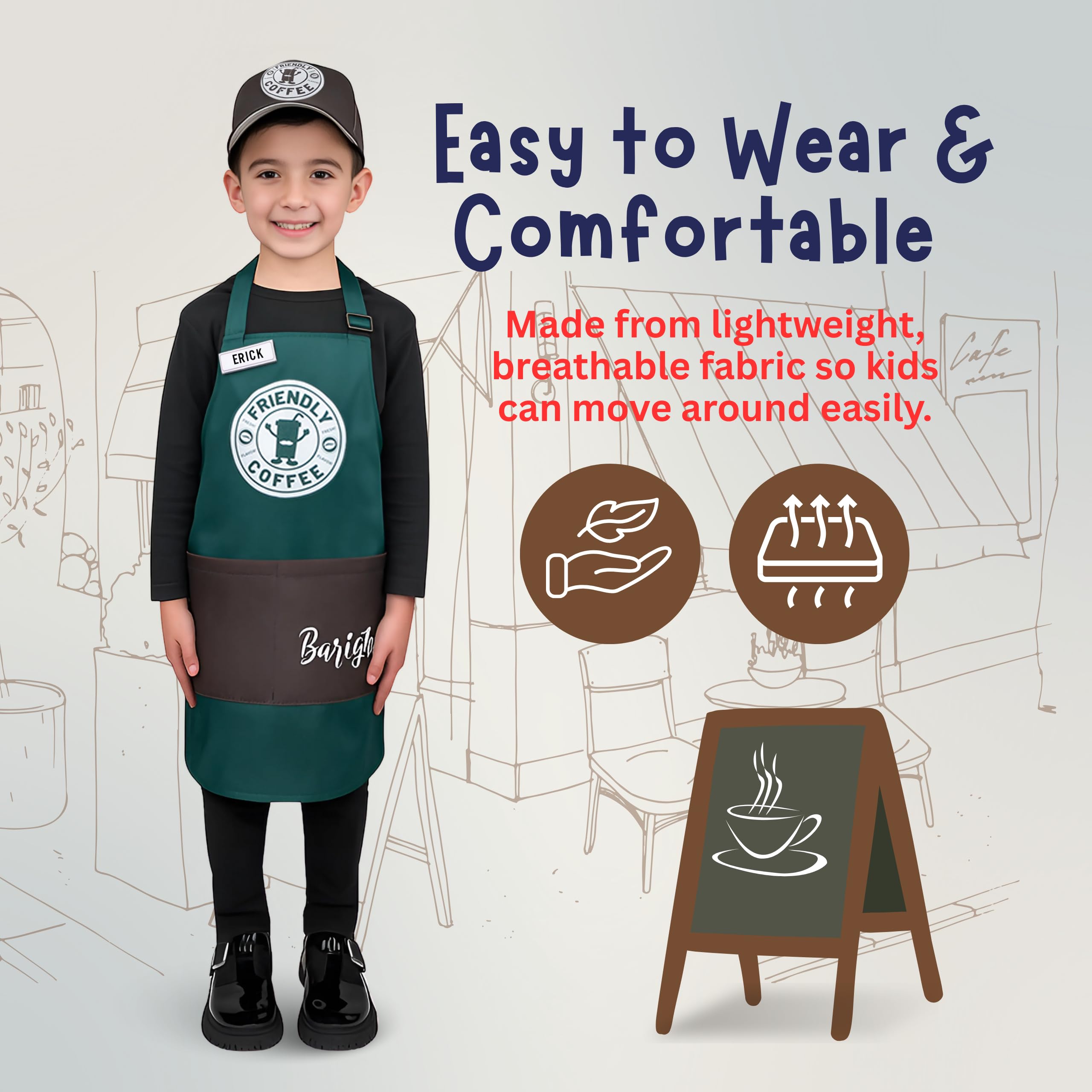 - Coffee Cap - The brown cap features the "Friendly Coffee" logo and is easily adjustable in the back. The apron is also adjustable for a comfortable fit.
