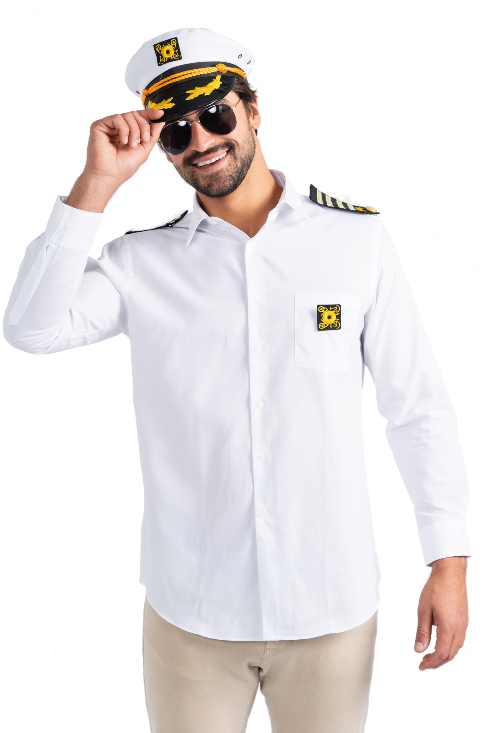 - Yes, Captain - The white cap includes an embroidered insignia in the center and a black visor for a completed look. The sunglasses are included for an alternate look.