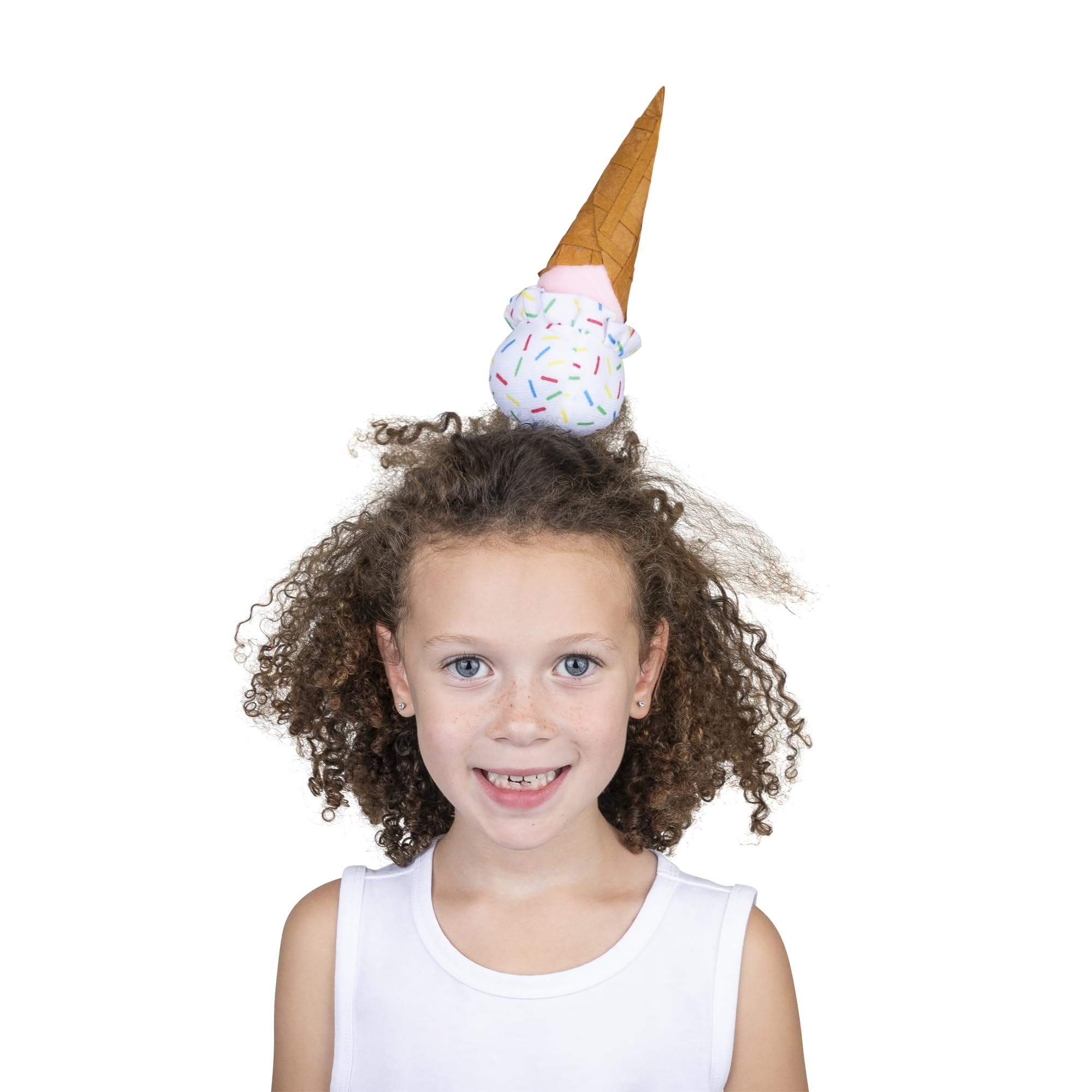 - Ice Cream Headband - The ice cream cone headband features a brown felt cone with a scoop of vanilla ice cream covered in colorful sprinkles.