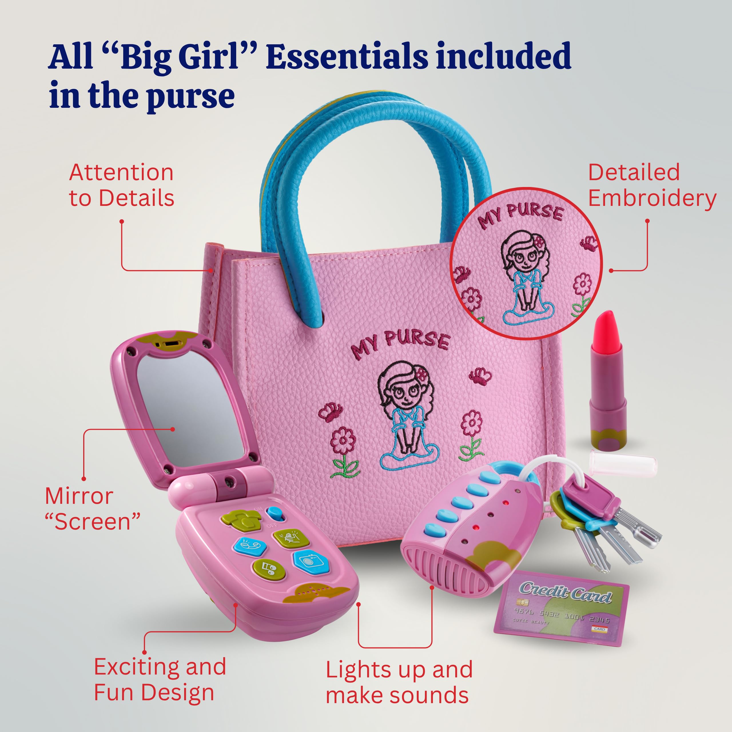 - MY FIRST PURSE SET - The set includes a purse, toy cell-phone, car remote and keys, lipstick, and credit card (batteries included). The pretend play purse set is sure to delight your young lady. Surprise her with this gift and see her delight.