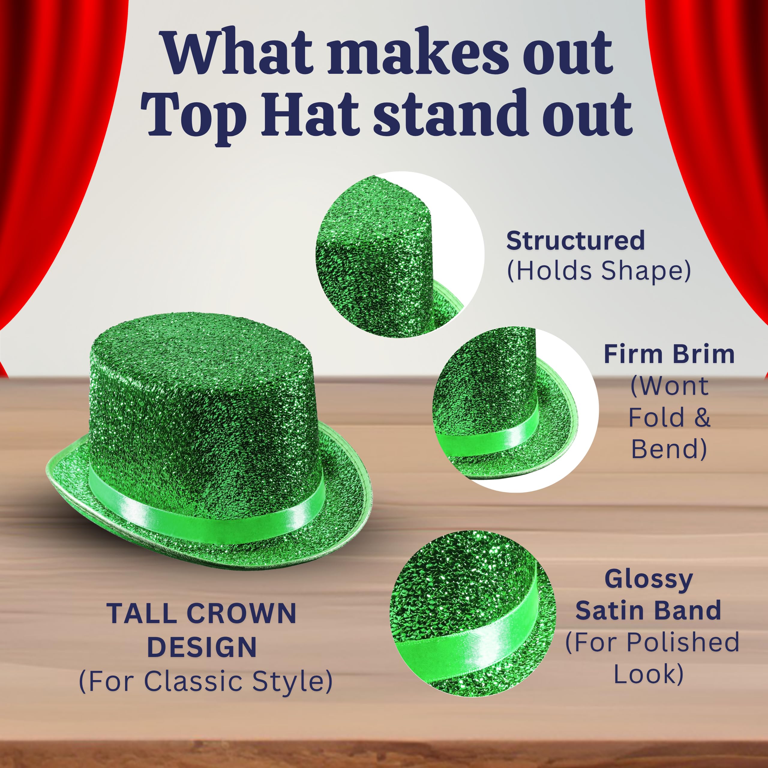 - Practical design - the top hat has a shiny glittery look yet leaves out the mess that glitter usually leaves in its wake. This top hat will dress up any attire.
