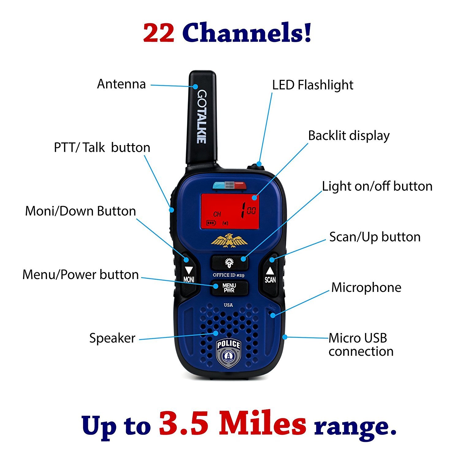 Walkie Talkies for Kids – Set of 2 Long-Range 22 Channel Portable Radios w/Built-in Flashlight, LCD Screen & 8 Interchangeable Theme Plates – Play Police, Spy, Fireman & Army Soldier